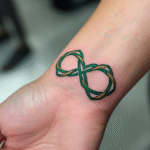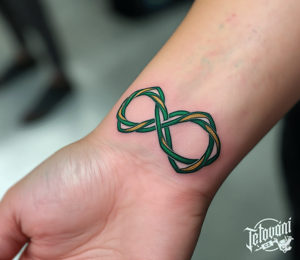 Tetování zelená ležatá osmička na předloktí