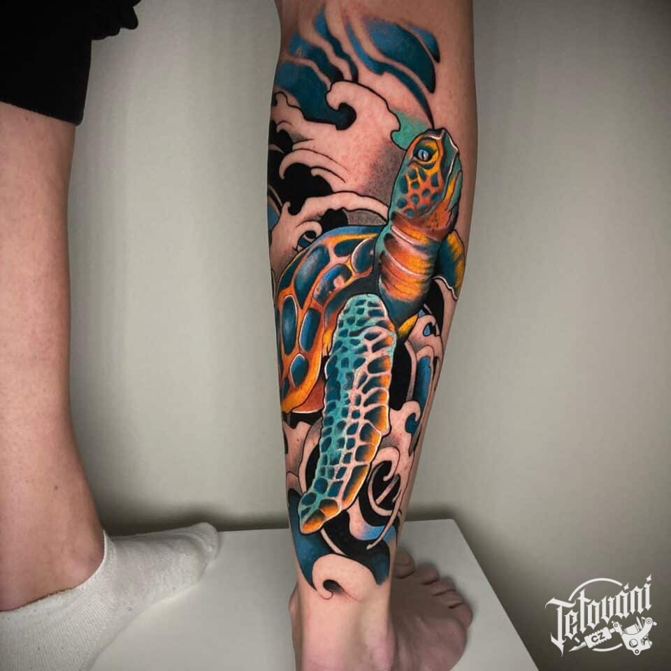 Tetování želva na lýtku