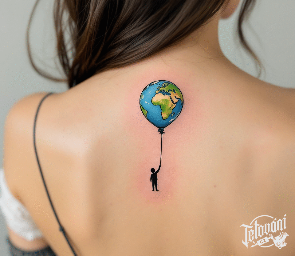Tetování zeměkoule, planeta jako balón mezi lopatky