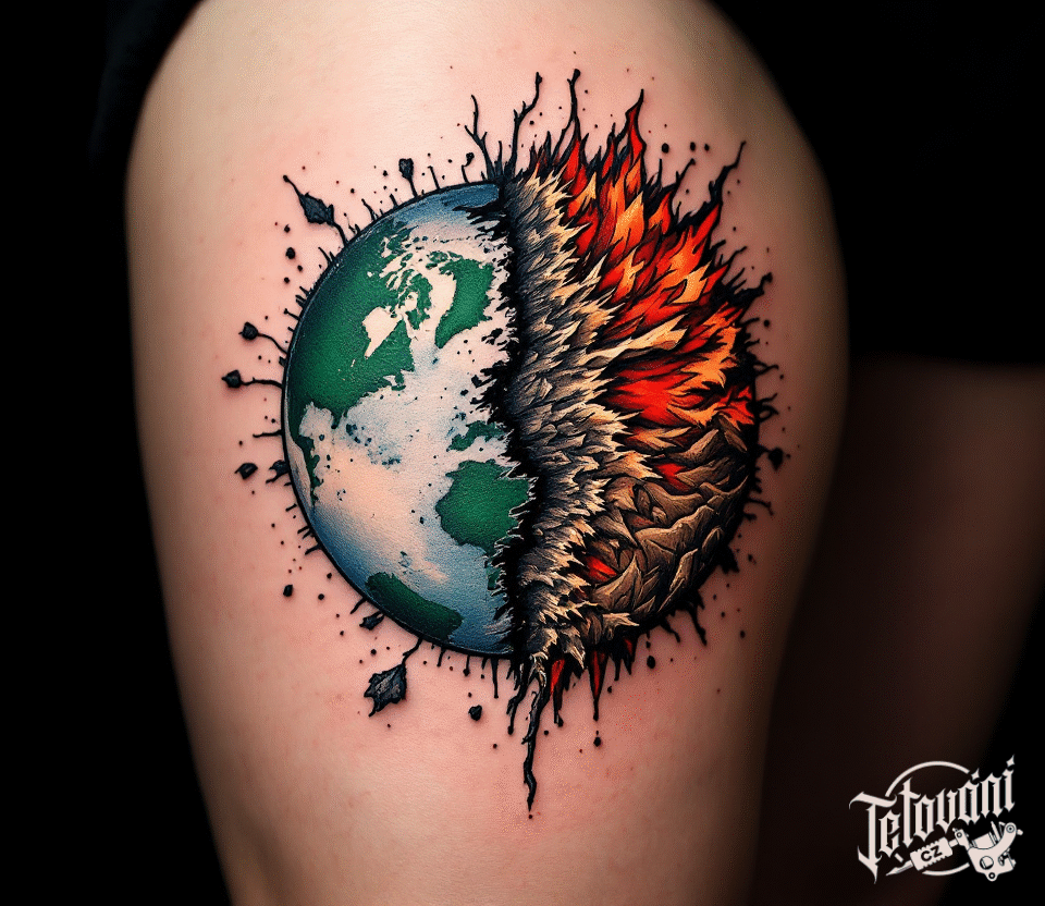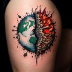 Tetování zeměkoule planety, oheň, symbol života na bok stehna