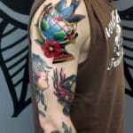 Tetování zeměkoule, zvíře vlaštovka, květiny na rameno
