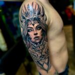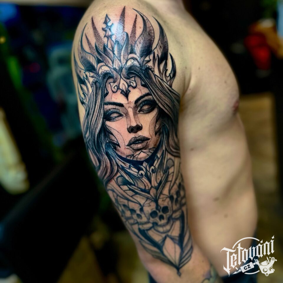 Tetování žena a lebky na rameno