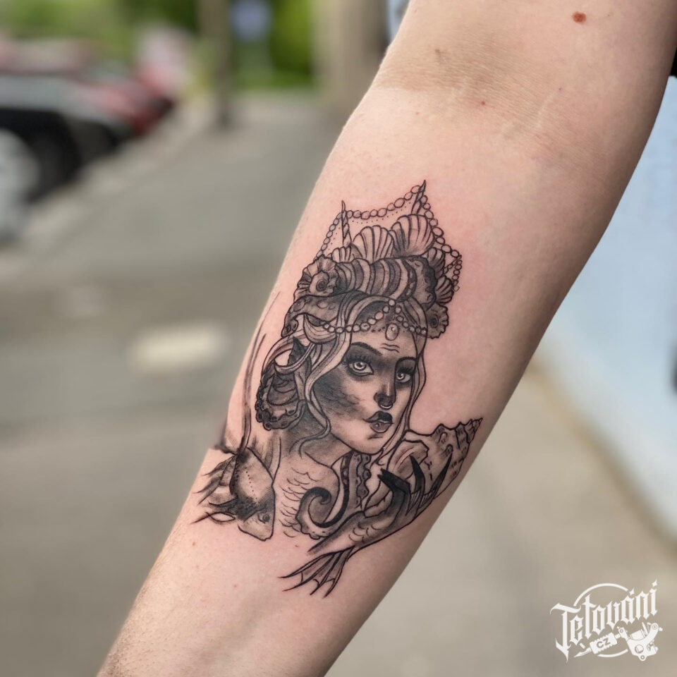 Tetování žena a zvířata, ryba na předloktí