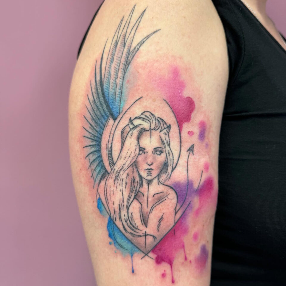 Tetování žena anděl s ďáblem na rameni