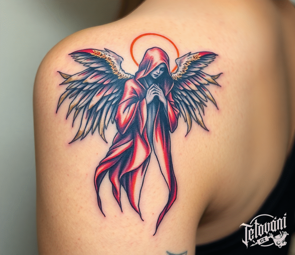 Tetování žena anděl smrti na rameni