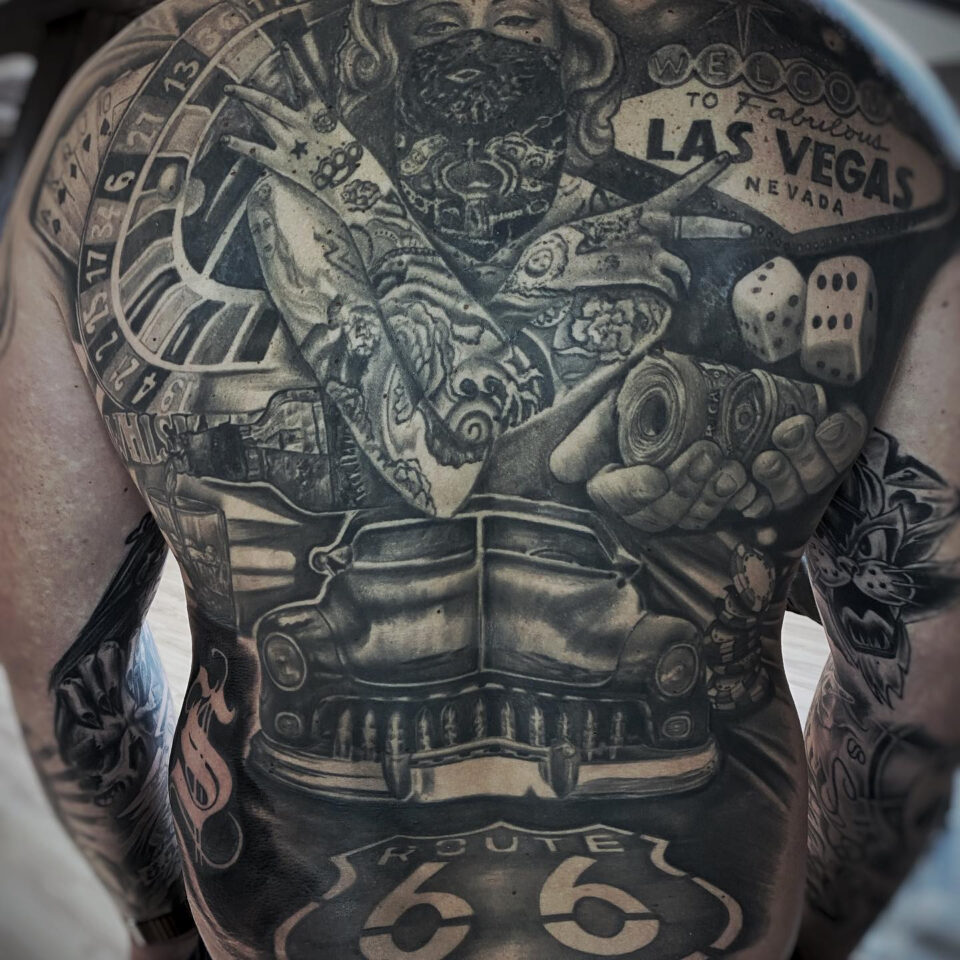 Tetování žena, auto, hrací kostky, nápisy na zádech