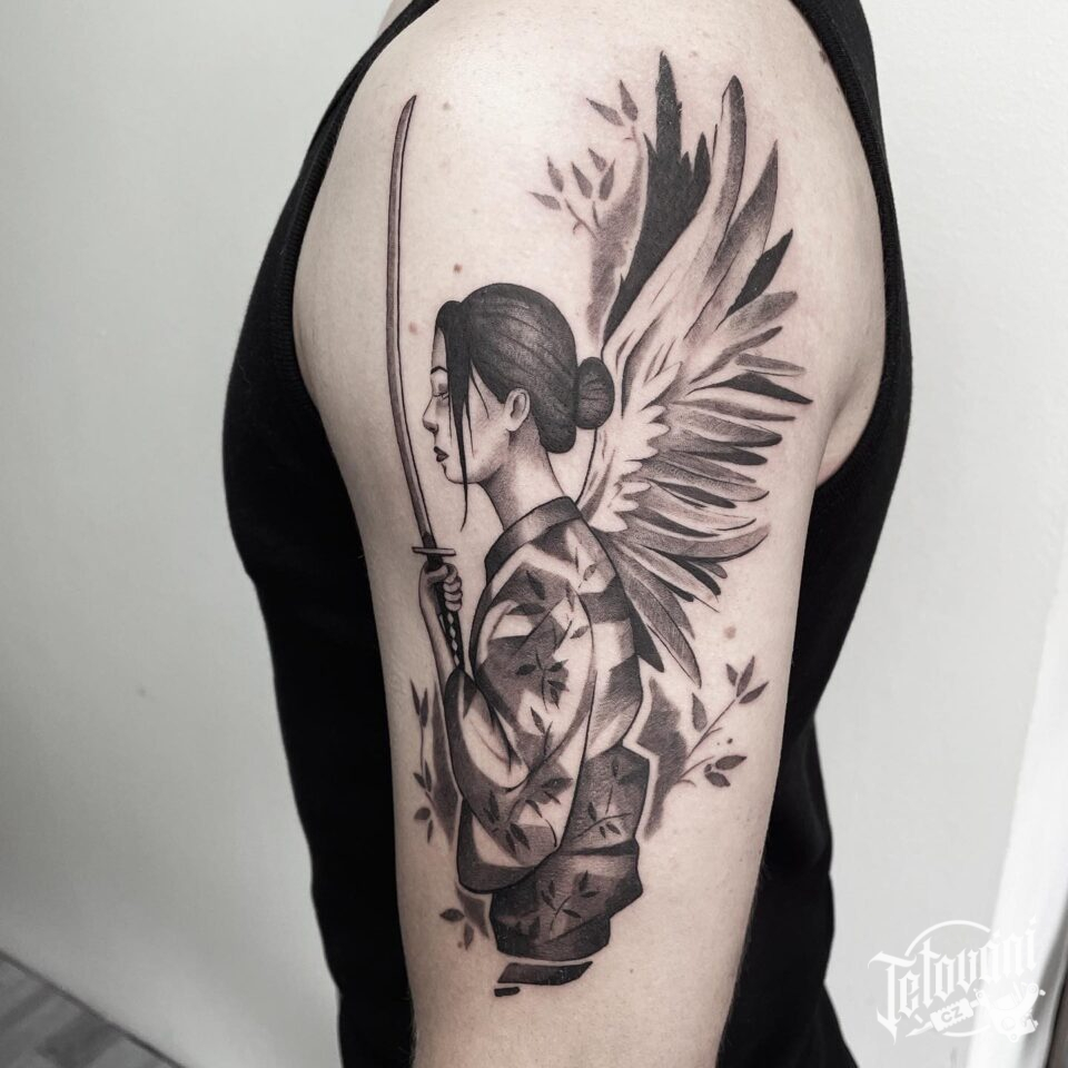 Tetování žena, bojovnice s křídly a mečem na rameni