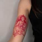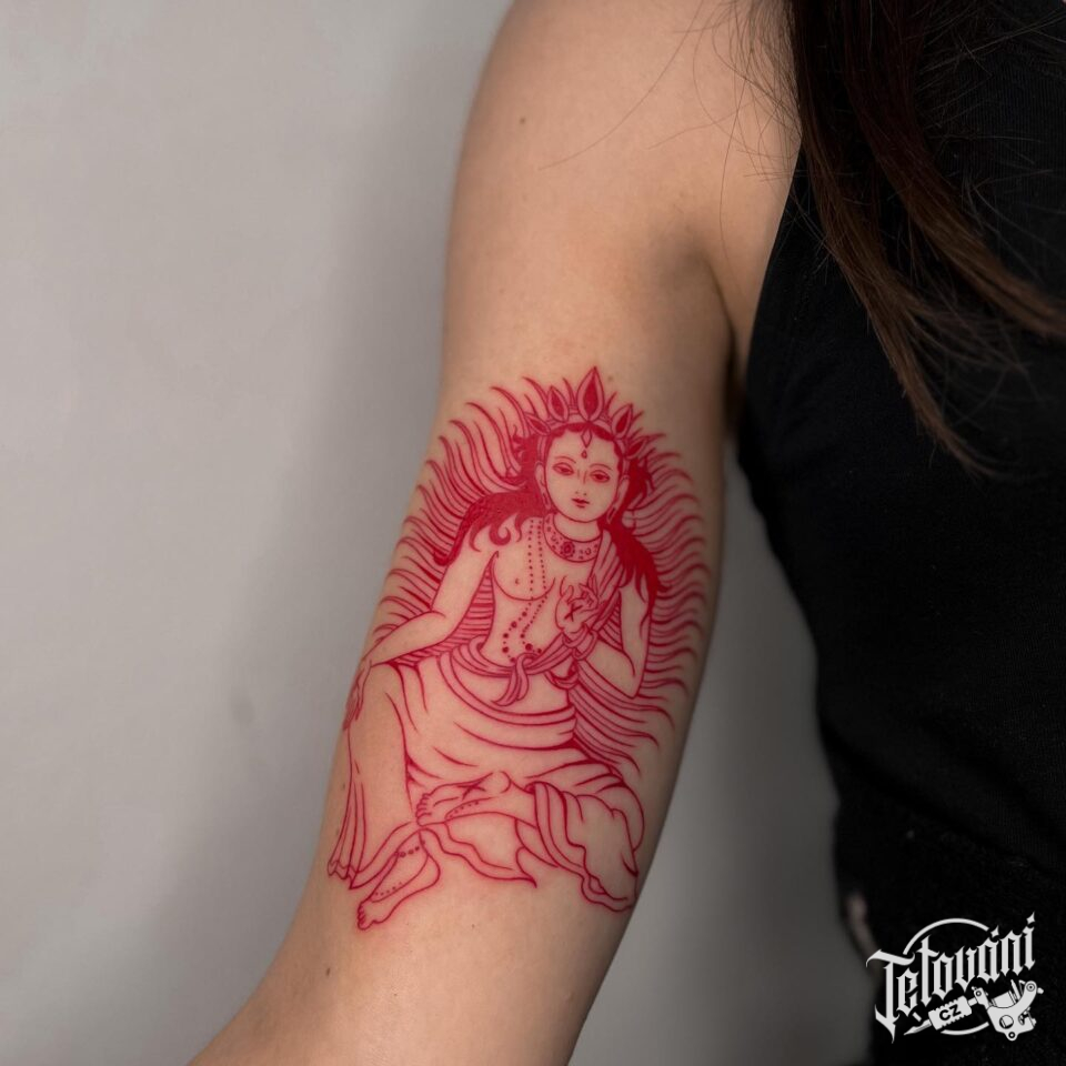 Tetování žena buddha, symbol vysvobození na bicepsu