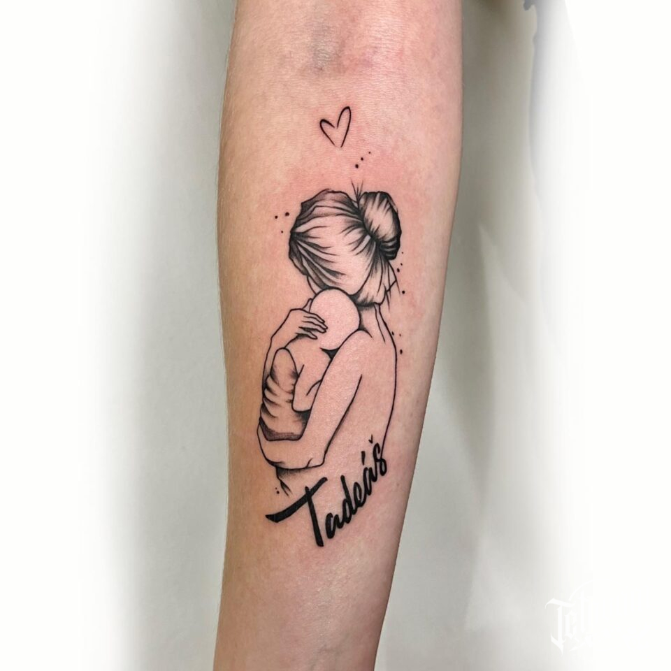 Tetování žena, dítě, rodina, jméno na předloktí