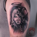 Tetování žena, dobro a zlo, anděl a ďábel na rameni