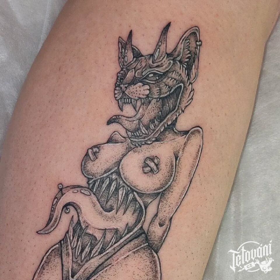 Tetování žena, anime jako nadpřirozená bytost na holeň