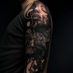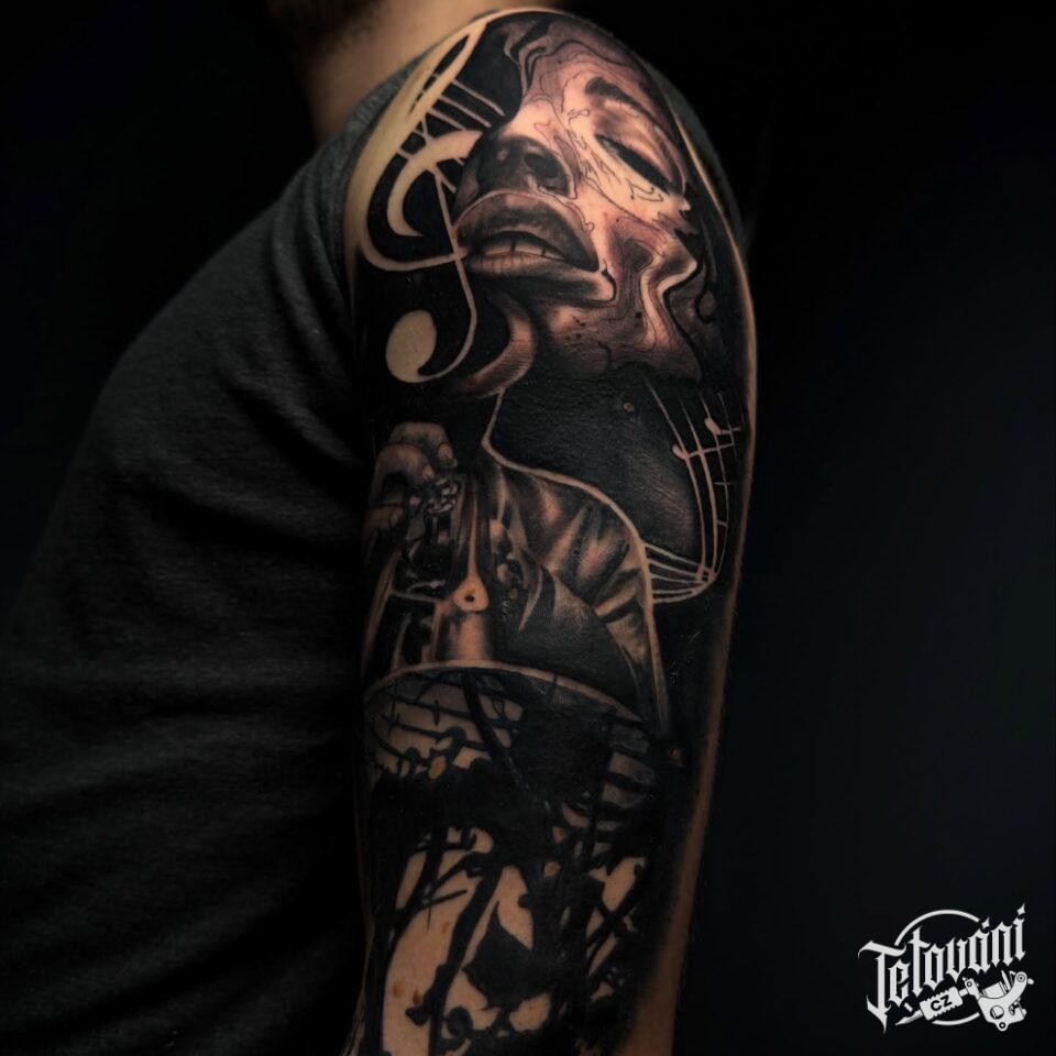 Tetování žena, houslový klíč, noty, hudba na rameno