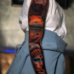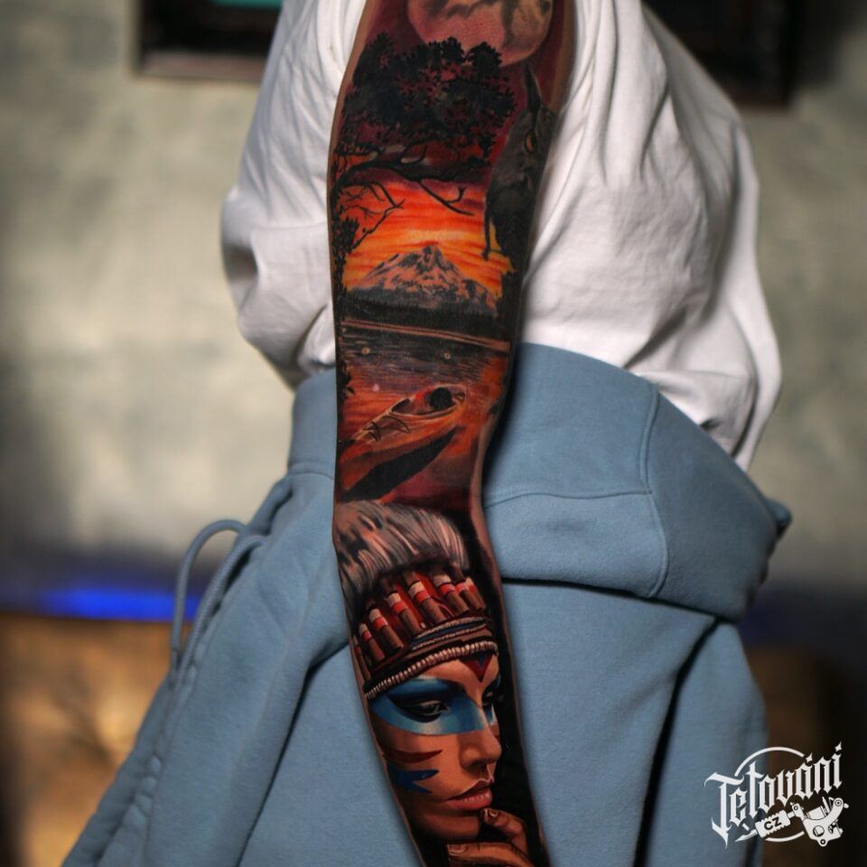 Tetování žena indiánka, příroda, hory, měsíc, zvíře sova, rukáv