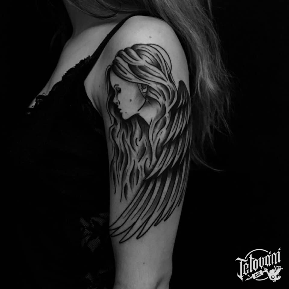 Tetování žena jako anděl s křídly na rameno
