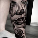 Tetování žena, jako klaun, květina růže na lýtko