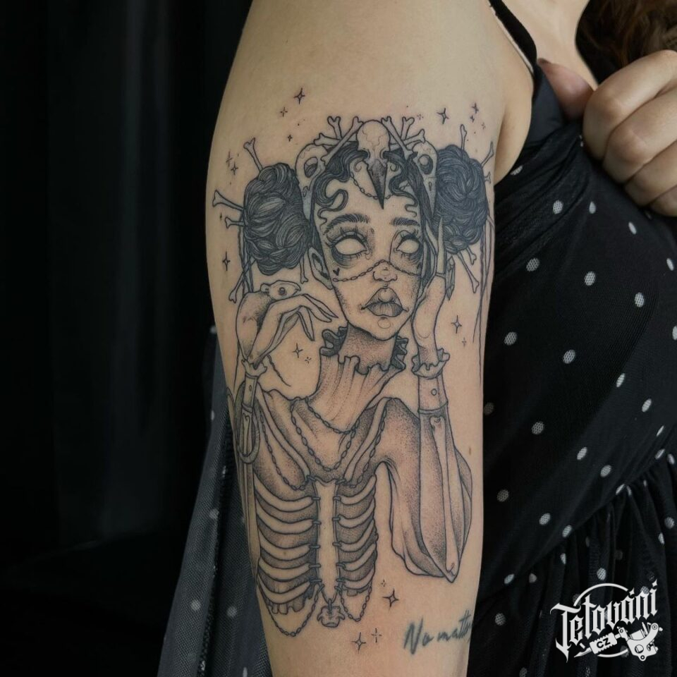 Tetování žena jako kostlivec, hvězdy na rameno