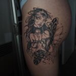 Tetování žena jako kostlivec s křídly na bok stehna