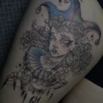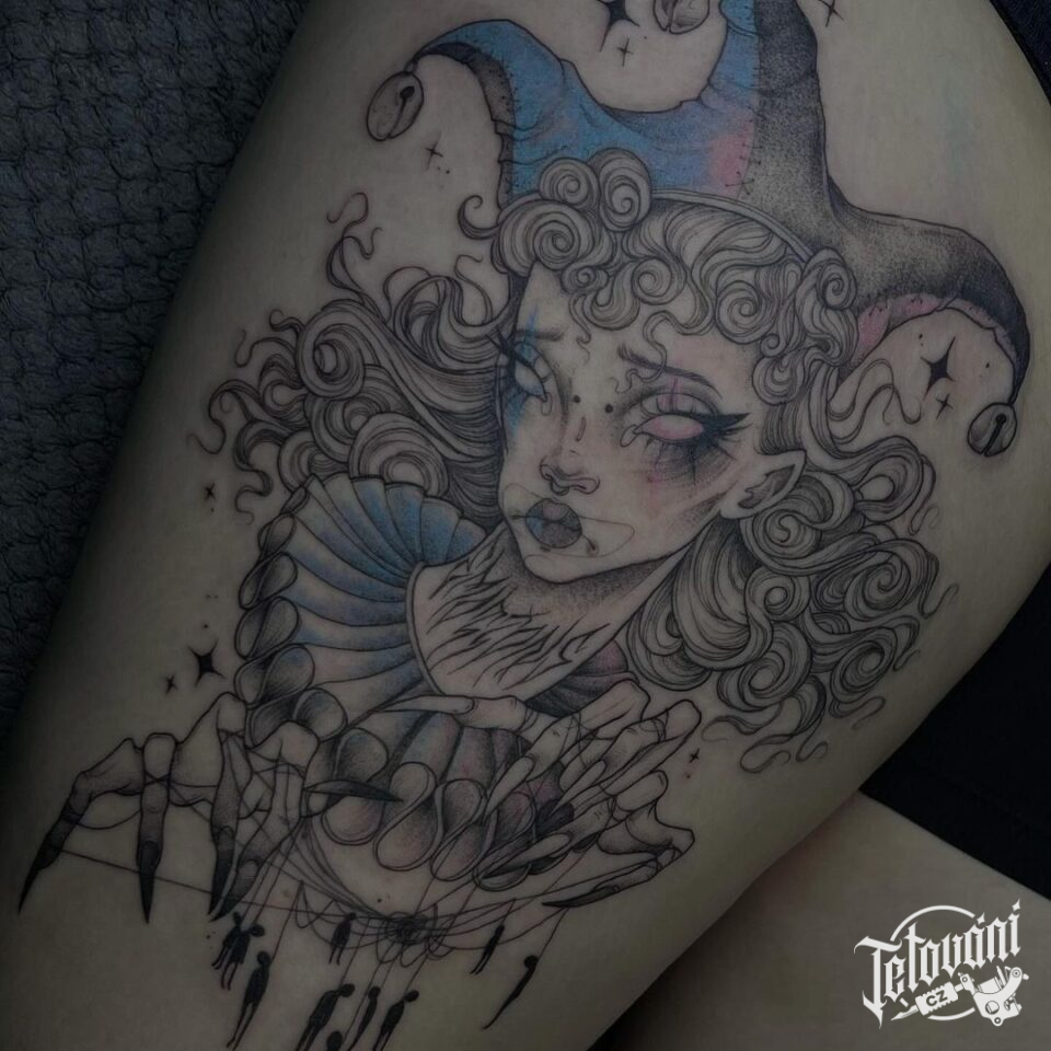 Tetování žena klaun na stehně
