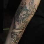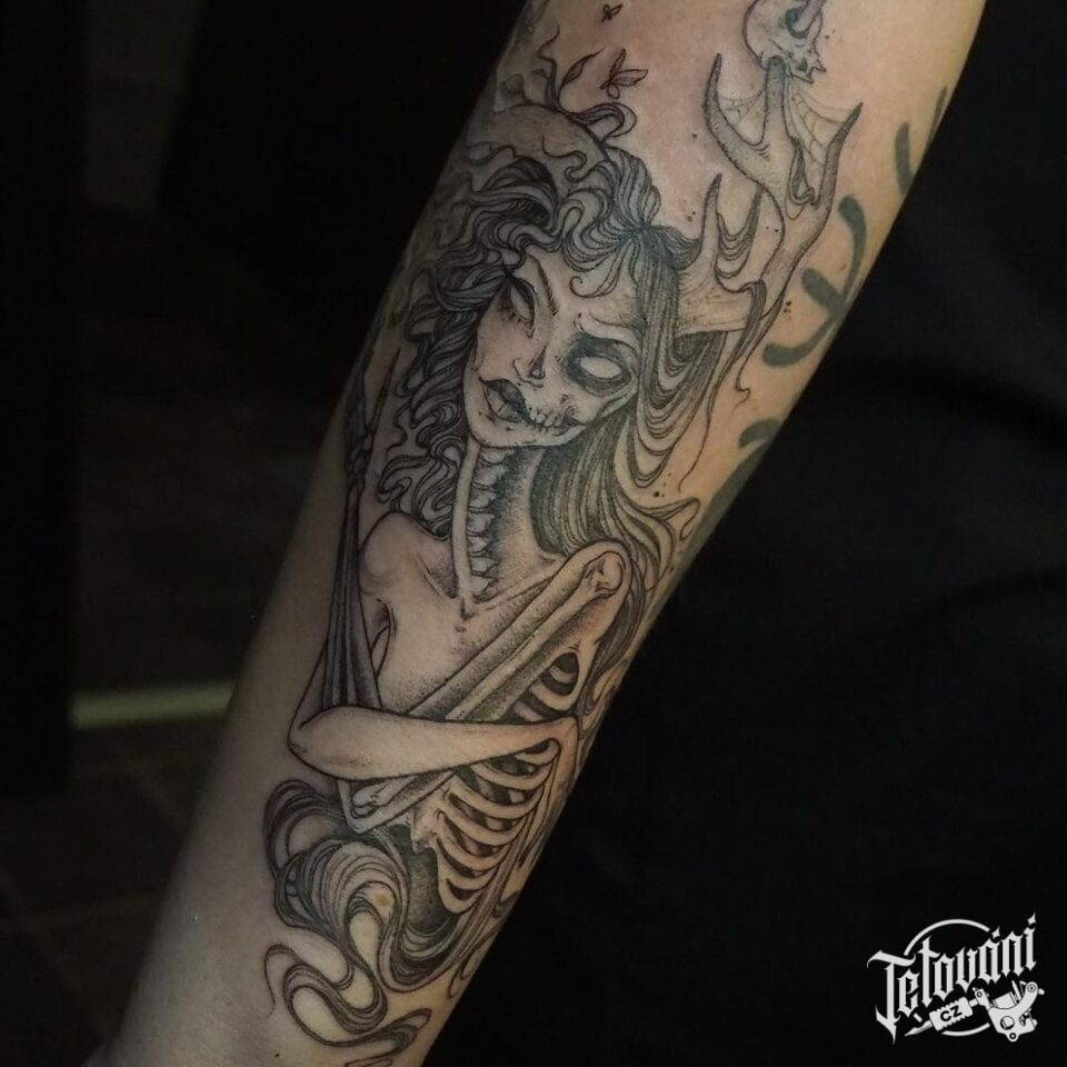Tetování žena, kostlivec, nadpřirozená bytost na předloktí