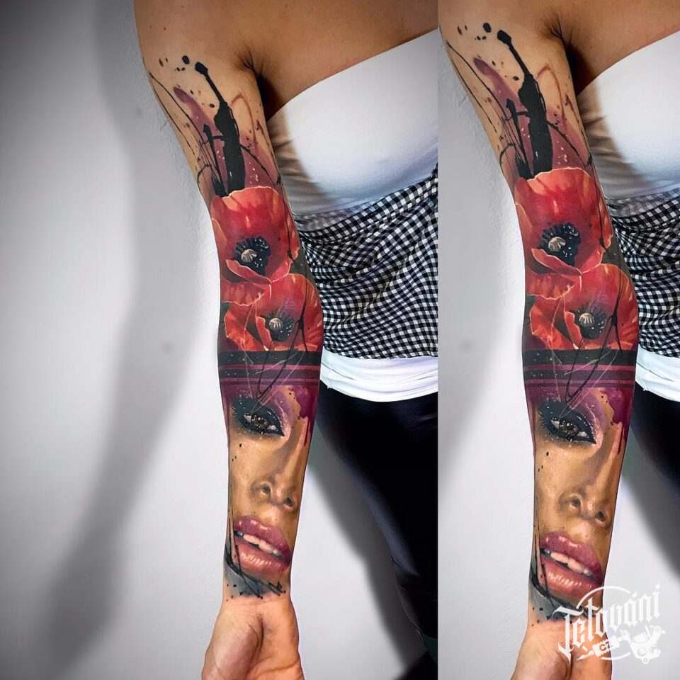 Tetování žena, květina vlčí mák, čáry, rukáv
