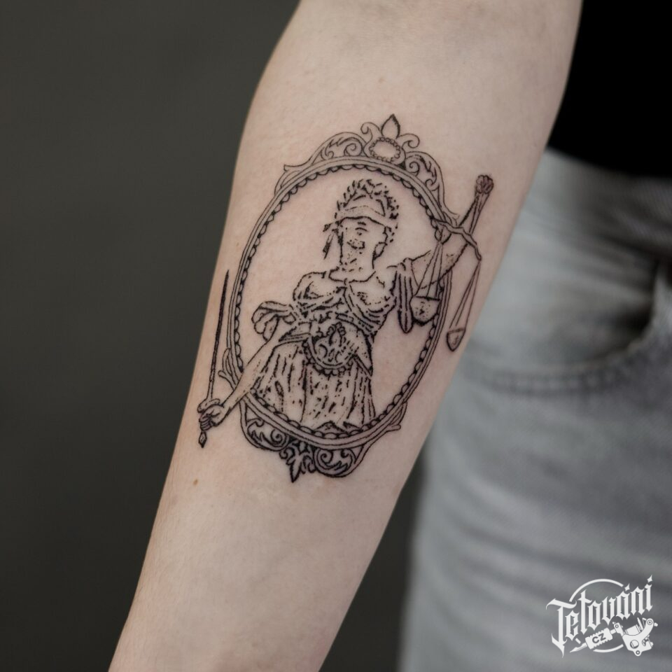 Tetování žena, lady Justice, Váhy znamení zvěrokruhu na předloktí