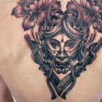 Tetování žena, maska draka, květiny a meče na zádech