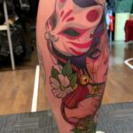 Tetování žena, maska, květina na holeň