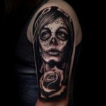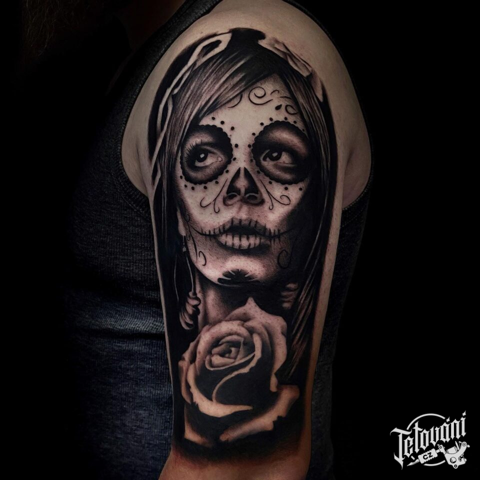 Tetování žena Muerte s růží na rameno