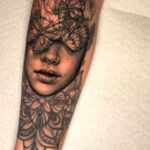 Tetování žena, portrét, ornamenty, motýly na předloktí