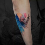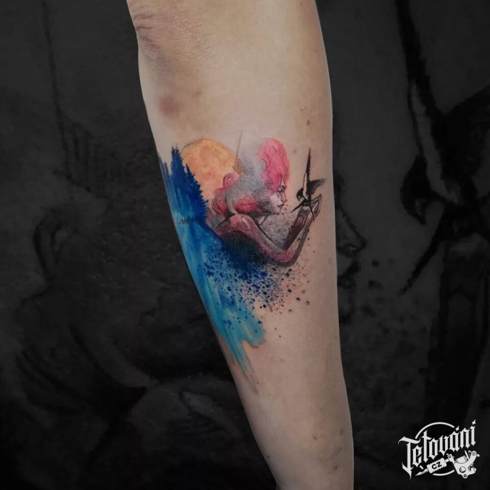 Tetování žena, příroda a pták na předloktí