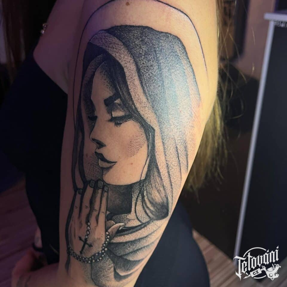 Tetování žena, ruce a růženec na rameni