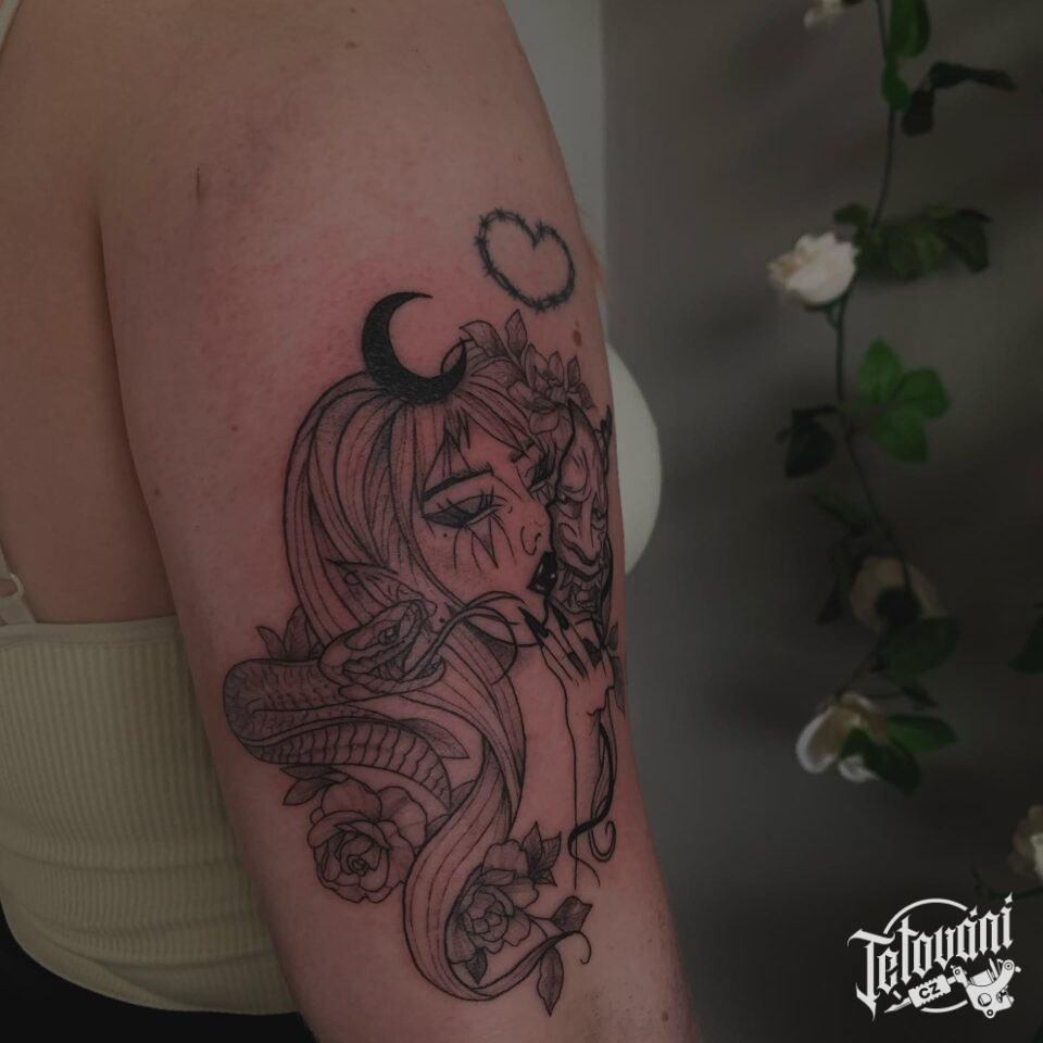 Tetování žena s ďáblem, květiny růže, zvíře had na rameno