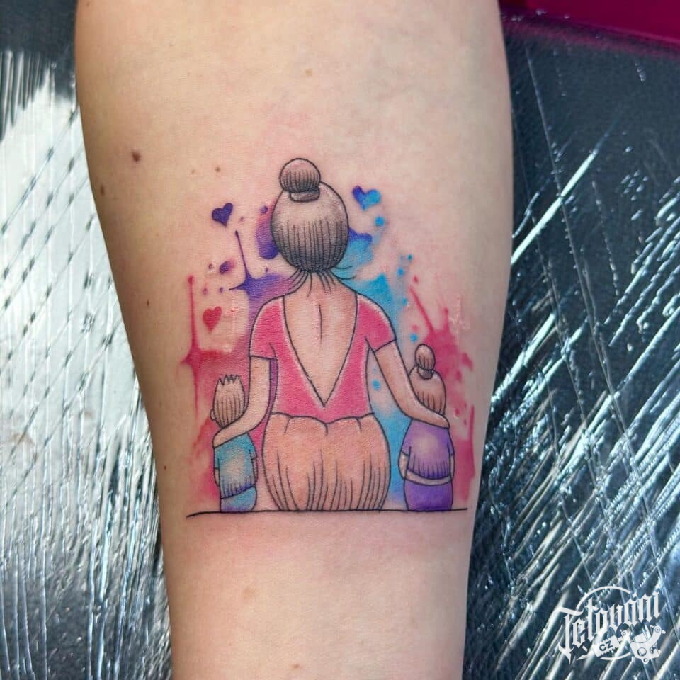 Tetování žena s dětmi, symbol rodiny na předloktí