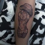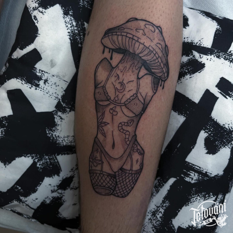 Tetování žena s hlavou mochomůrky, znak a symbol na lýtko