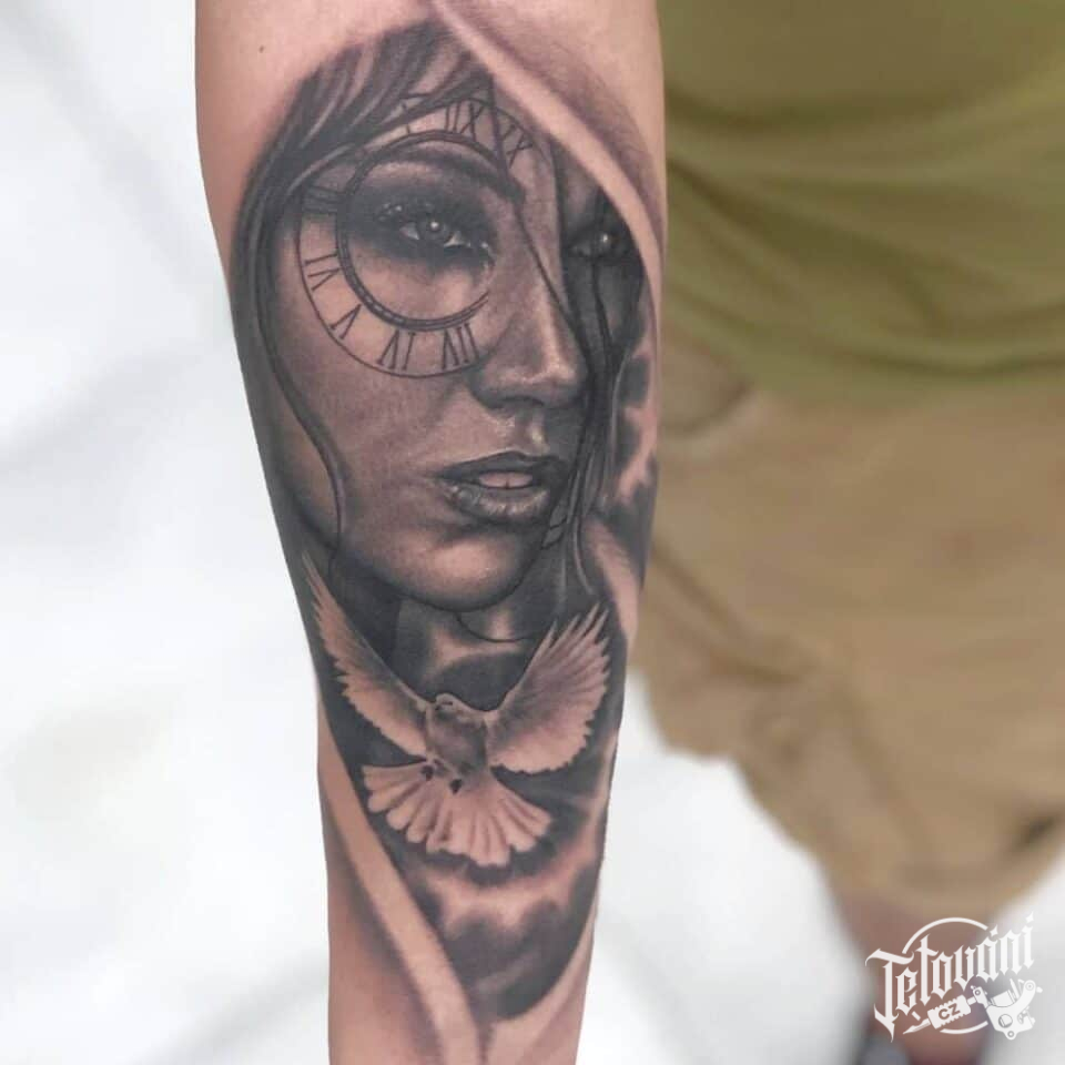 Tetování žena s holubicí a hodiny na předloktí