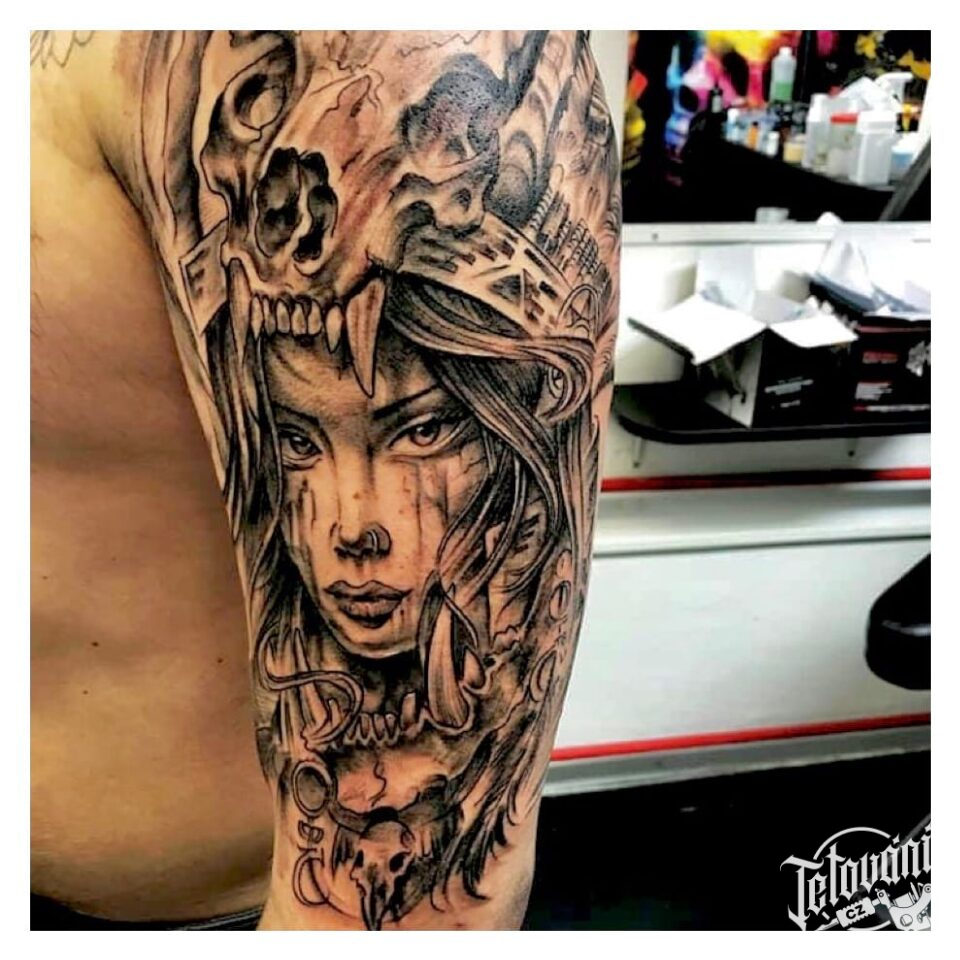 Tetování žena s lebkou na rameni