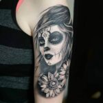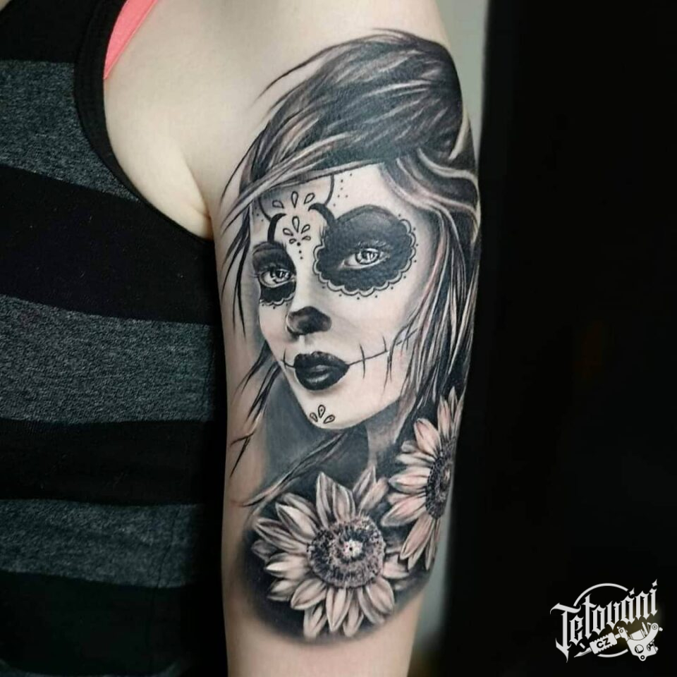 Tetování žena s maskou muerte, smrt, slunečnice na rameno