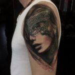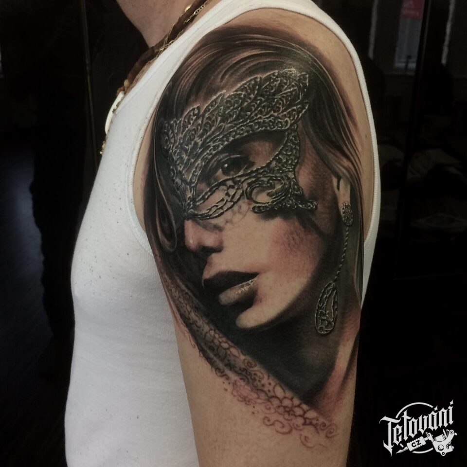 Tetování žena s maskou na očích na rameno