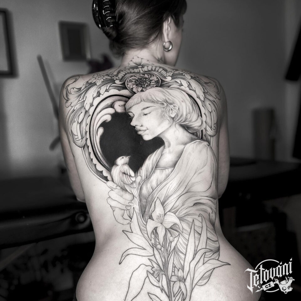 Tetování žena s ptákem a květinami u zrcadla s ornamenty na zádech
