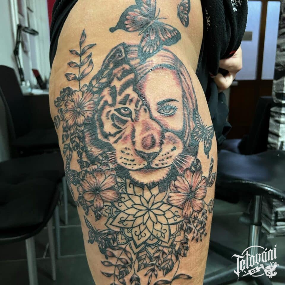 Tetování žena s tygrem, zvíře a květiny na bok stehna
