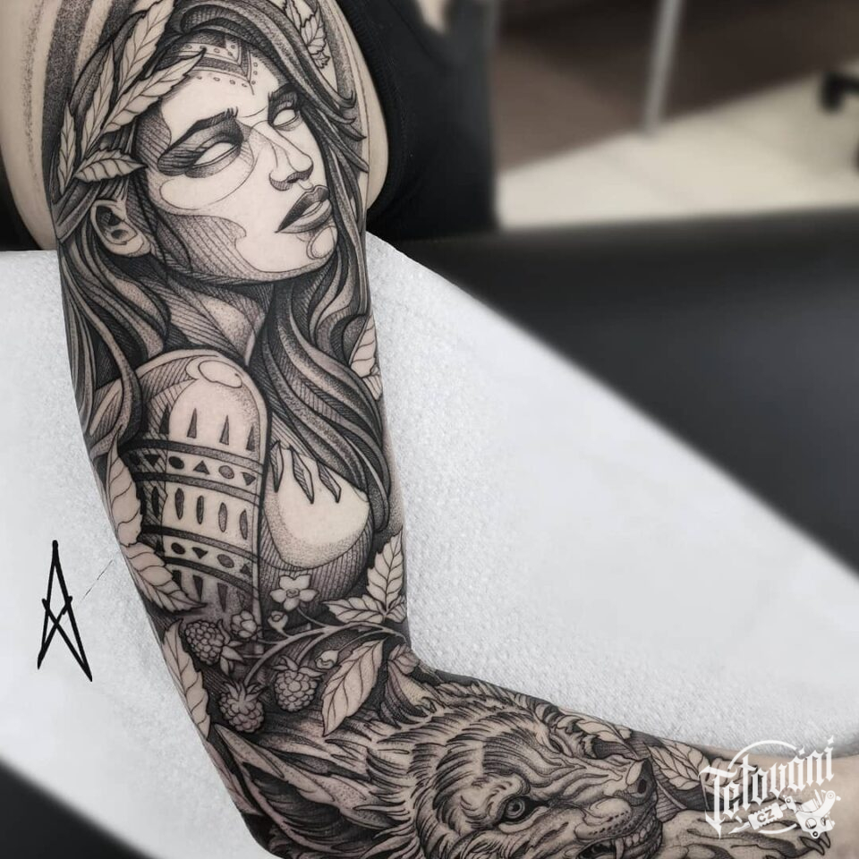 Tetování žena s vlkem, rukáv