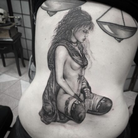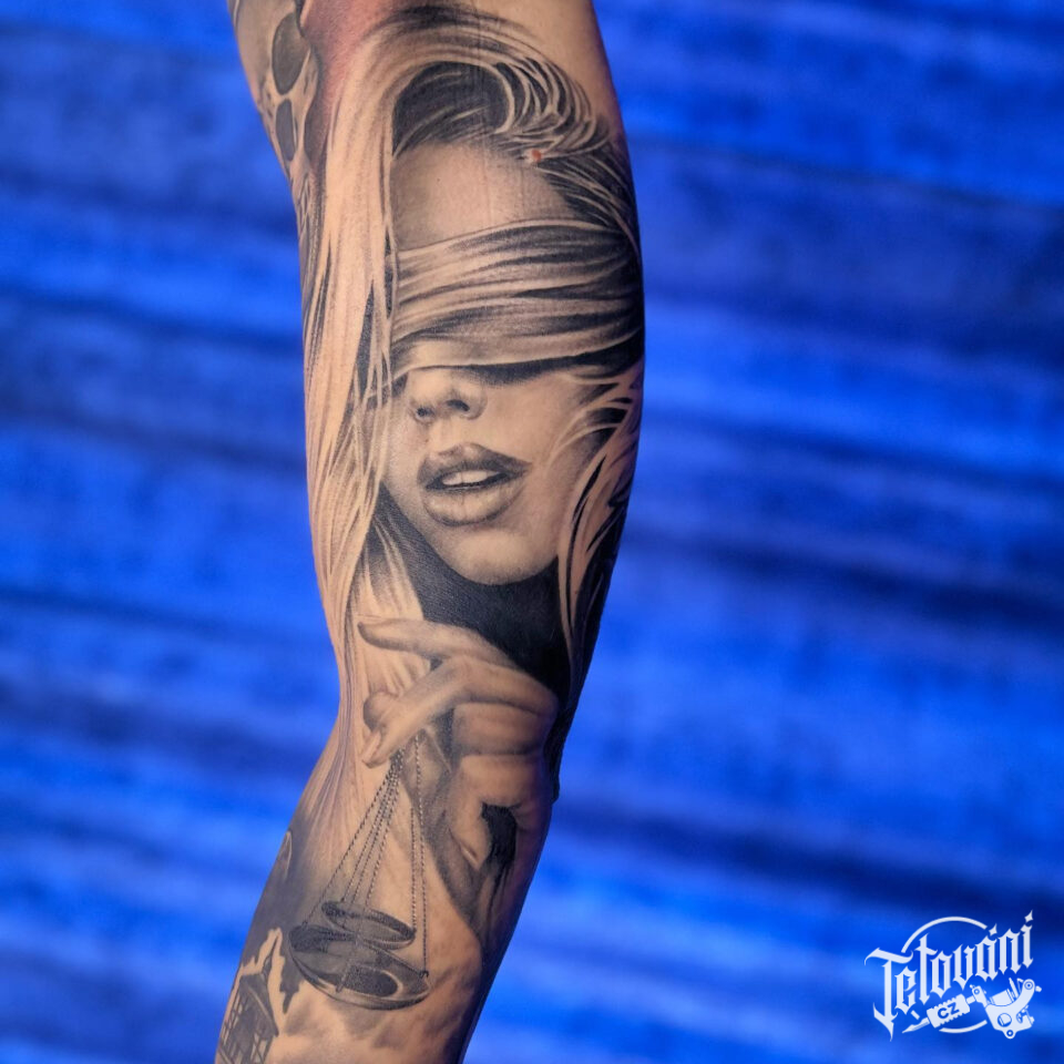 Tetování žena se šátkem přes oči, znamení zvěrokruhu váhy na ruku