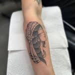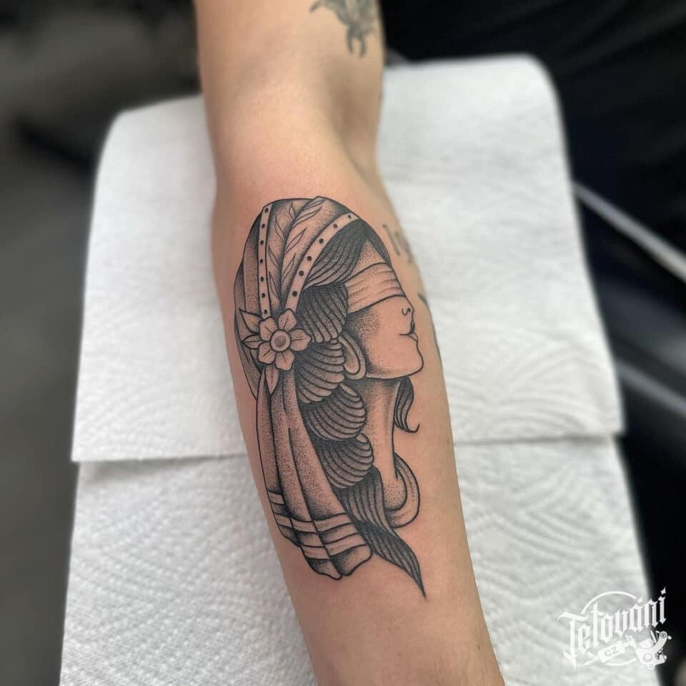 Tetování žena se zavázanými oči na předloktí