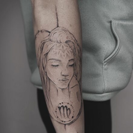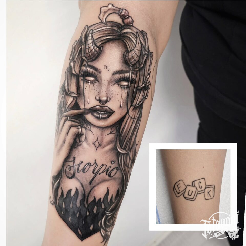 Tetování žena štír znamení zvěrokruhu na předloktí