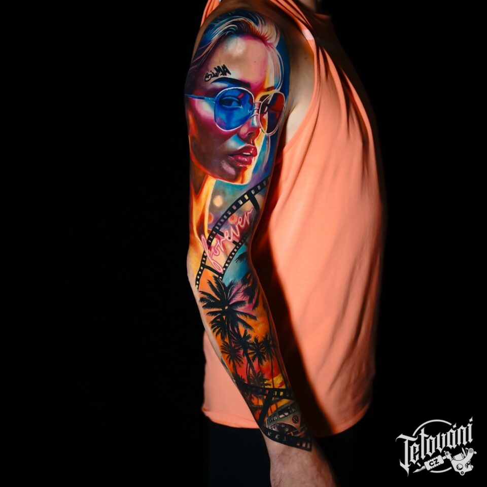 Tetování žena, strom palmy, rukáv