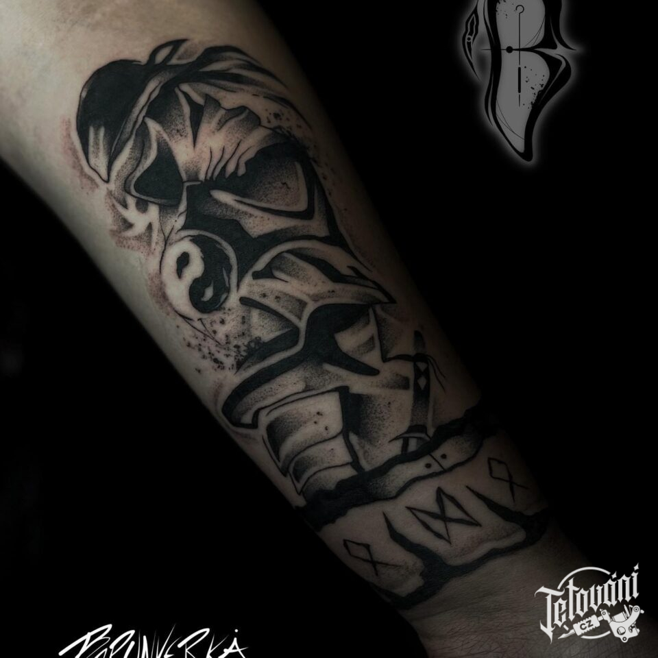 Tetování žena, symbol jin a jang, znaky a symboly na předloktí