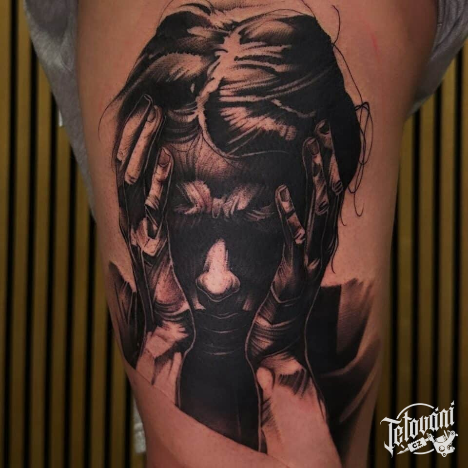 Tetování žena, symbol smutku na bok stehna