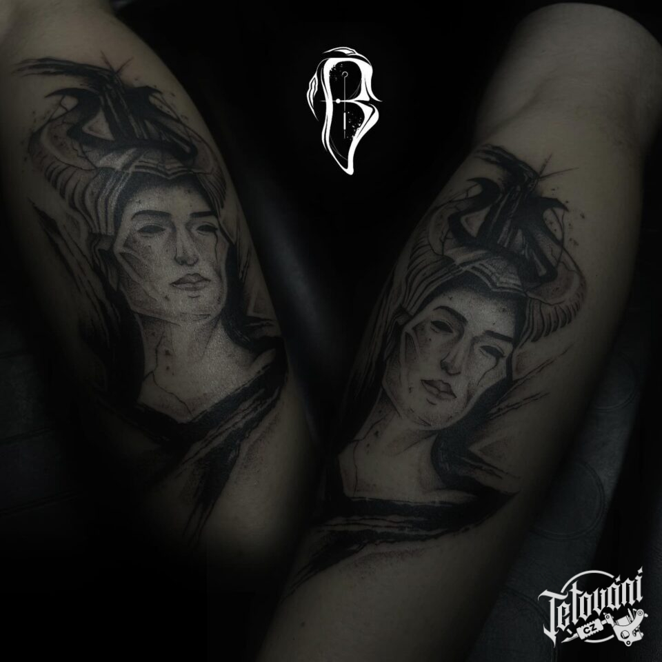 Tetování žena z filmů a pohádek Zloba, portrét na předloktí