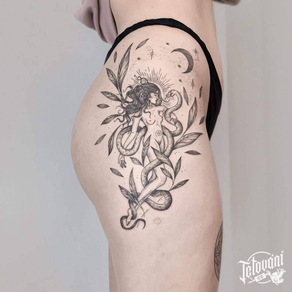 Tetování žena, zvíře had, větvičky, měsíc na bok stehna