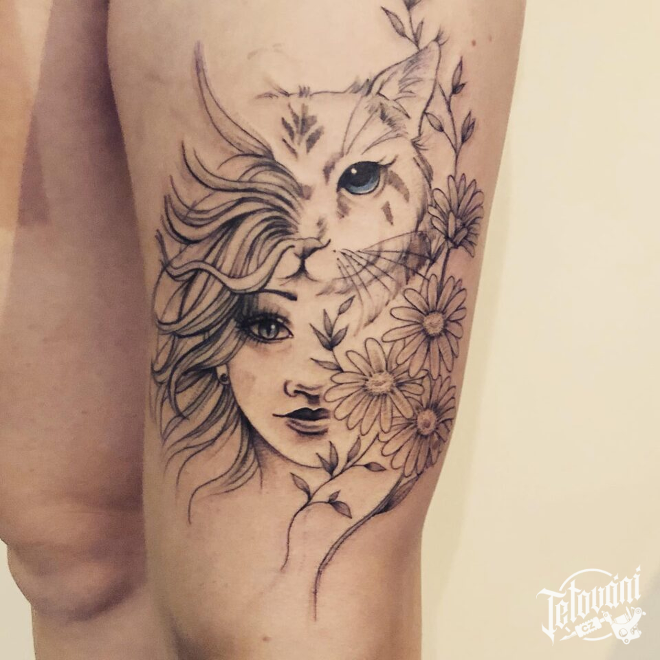 Tetování žena, zvíře kočka na stehno